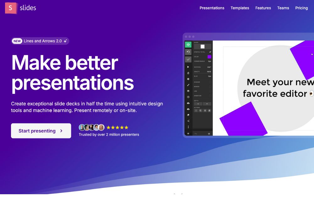 Slides promotes itself as “pixel-perfect” presentation software. Its editor includes a built-in grid to help with composition. Slides have a lower cost at the highest price tag, which suits smaller businesses.